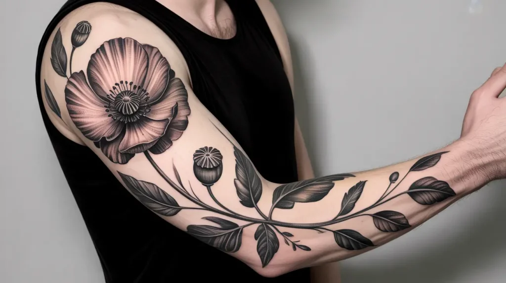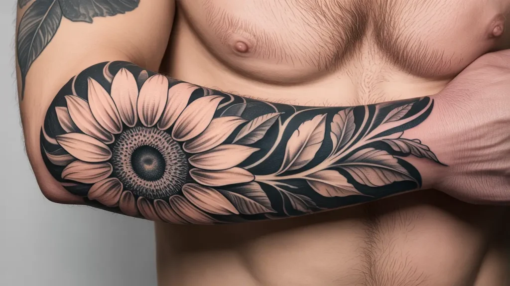 If you want positivity but still a masculine vibe, try sunflower tattoo design on sleeve. A sunflower in a half sleeve design feels strong and energetic. When combined with leaves and shadows, it fills space beautifully.