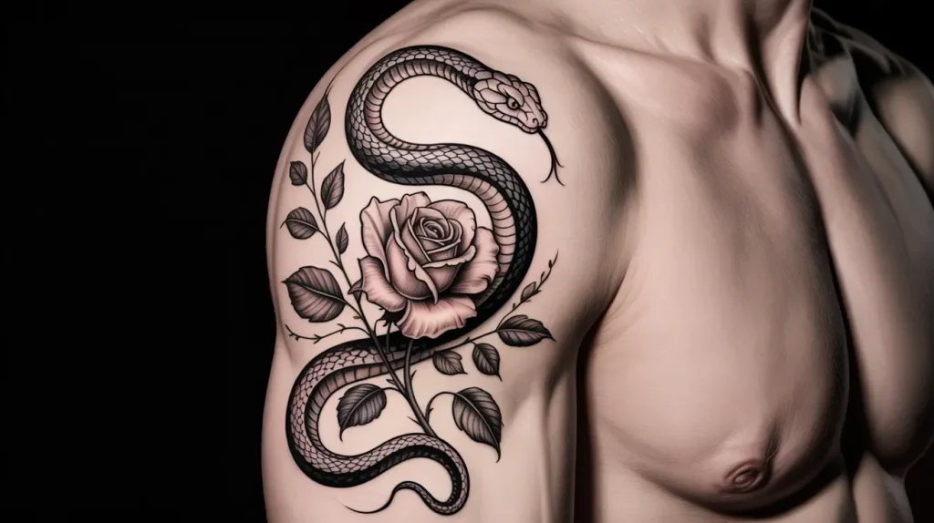 A snake wrapping around a rose feels intense and symbolic. It represents temptation, power, and transformation.