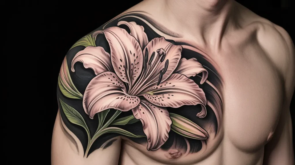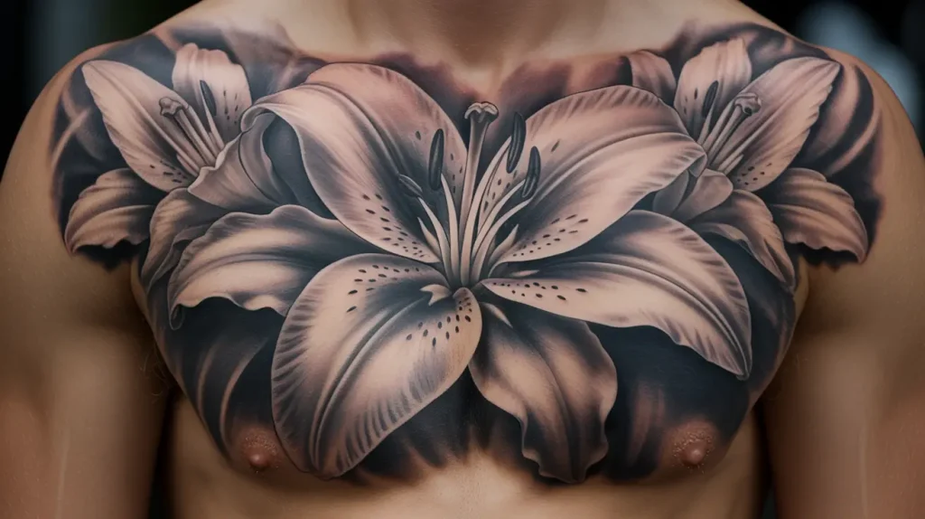 A large lily across the chest feels bold. The long petals stretch naturally across the skin.