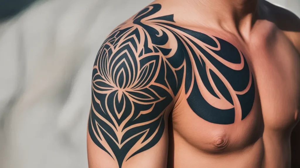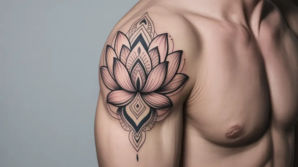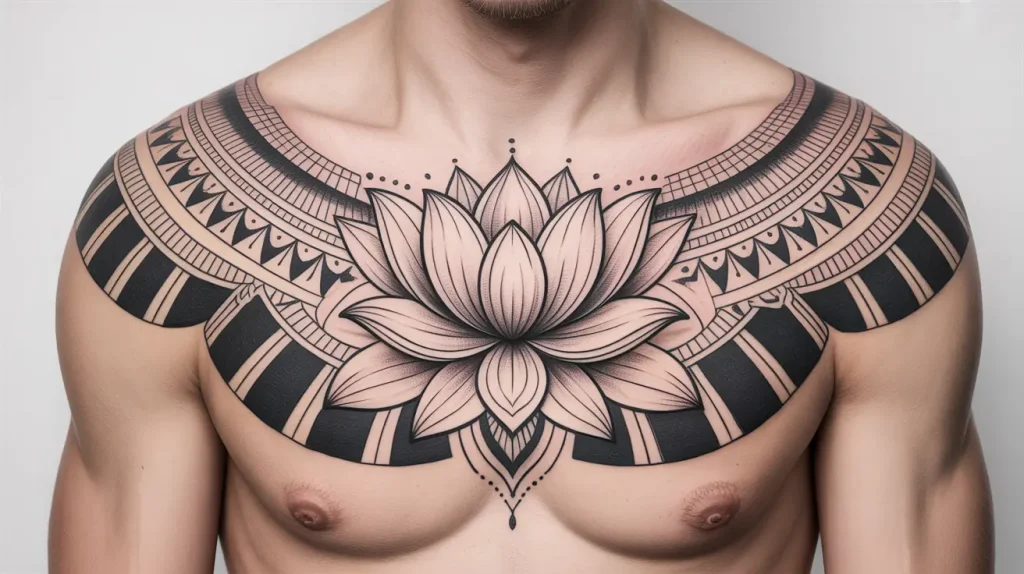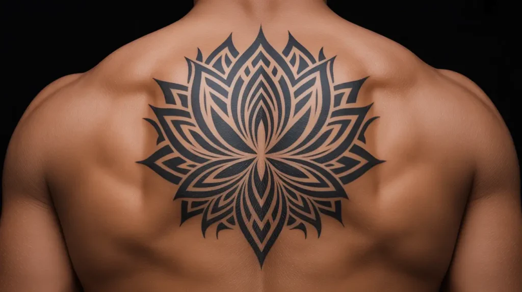 A lotus combined with geometric lines creates balance between nature and structure. The symmetry makes the design look sharp and intentional.