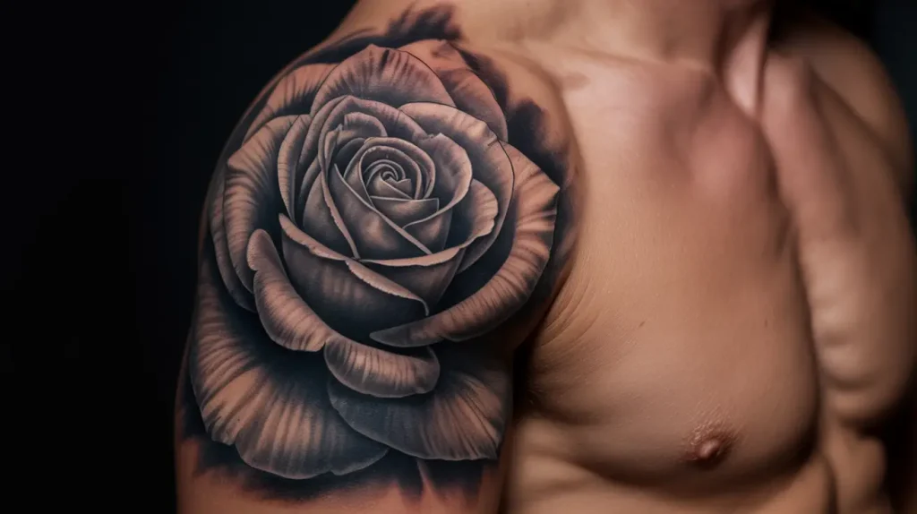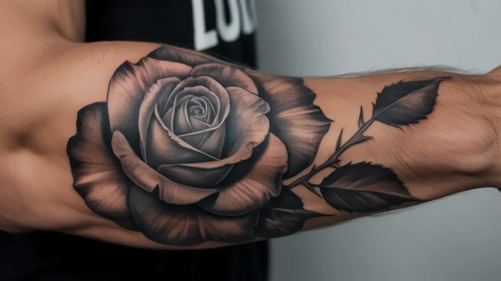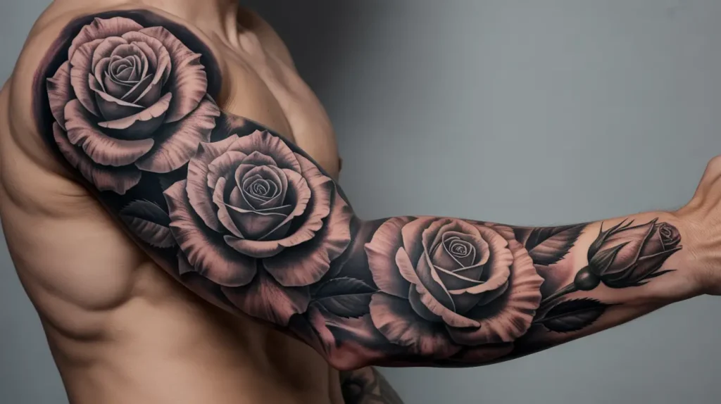 A rose on the shoulder or on full sleeve feels beautiful and confident. The soft petals contrast beautifully with the natural curve of your shoulder. You can go for red for passion, pink for romance, or black and grey for a classic look.