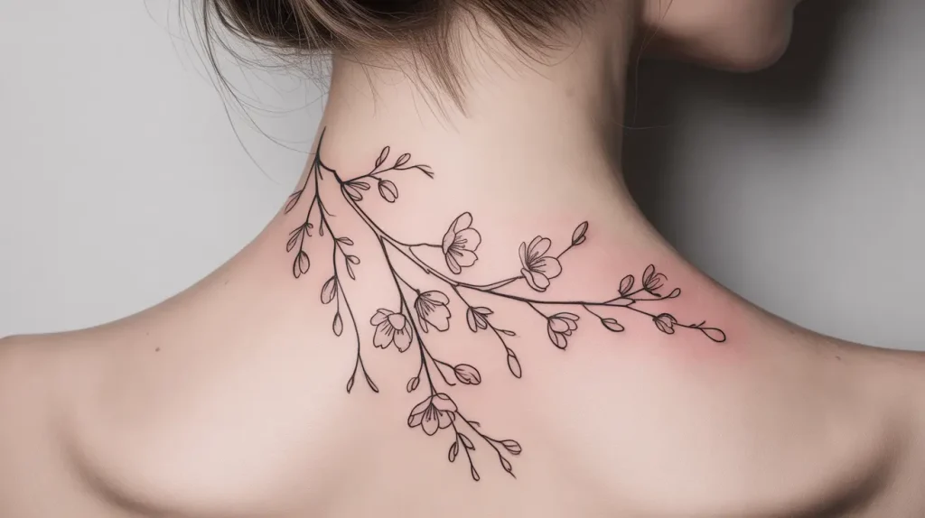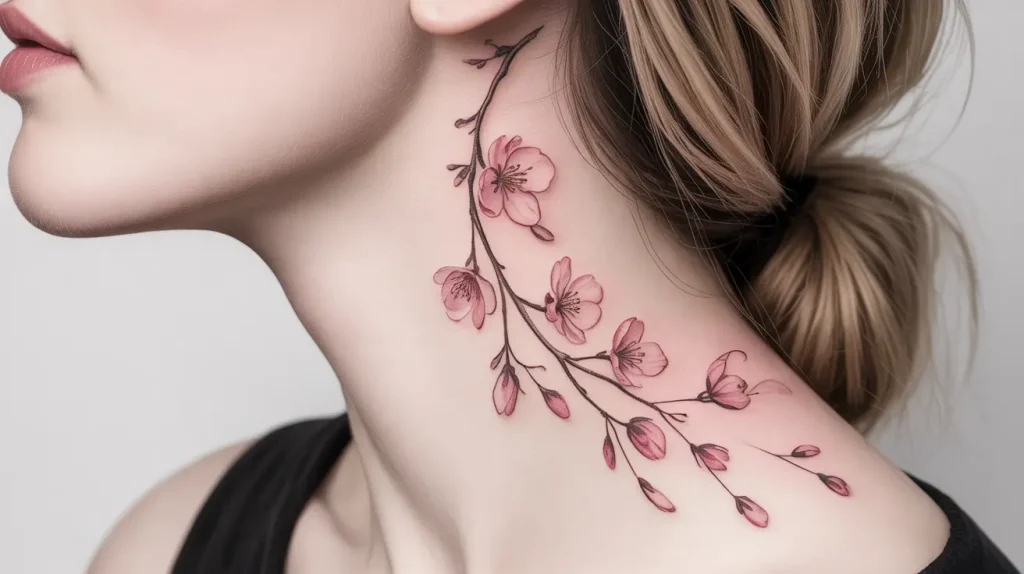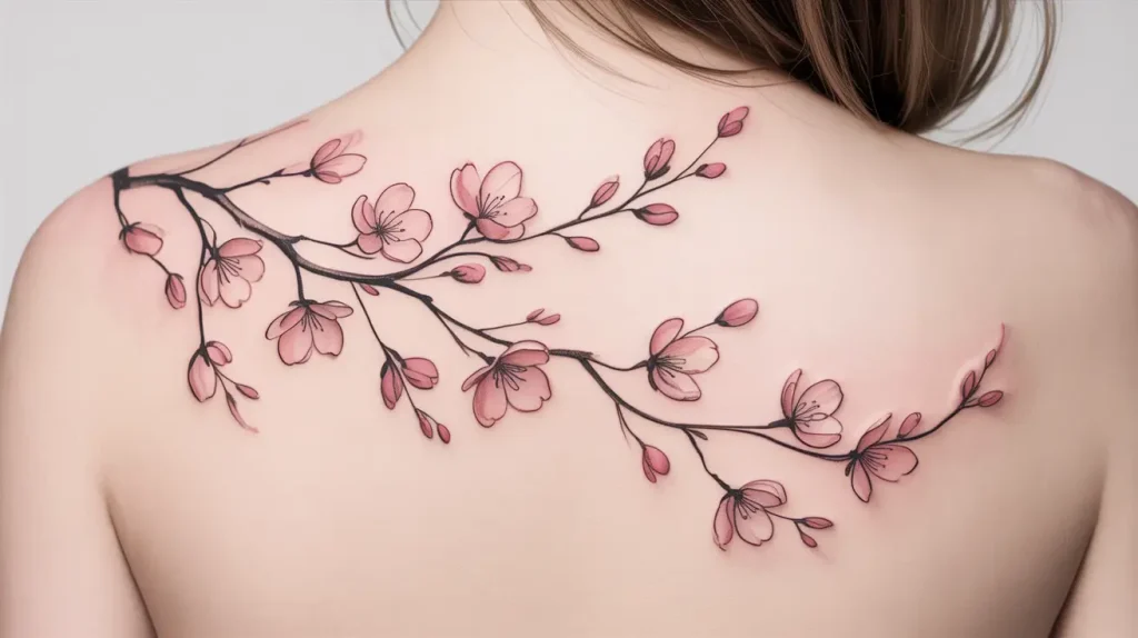 A small cherry blossom branch wrapping lightly around the wrist, shoulder, back and along neck side feels soft and romantic. The pink petals give a gentle feminine vibe.