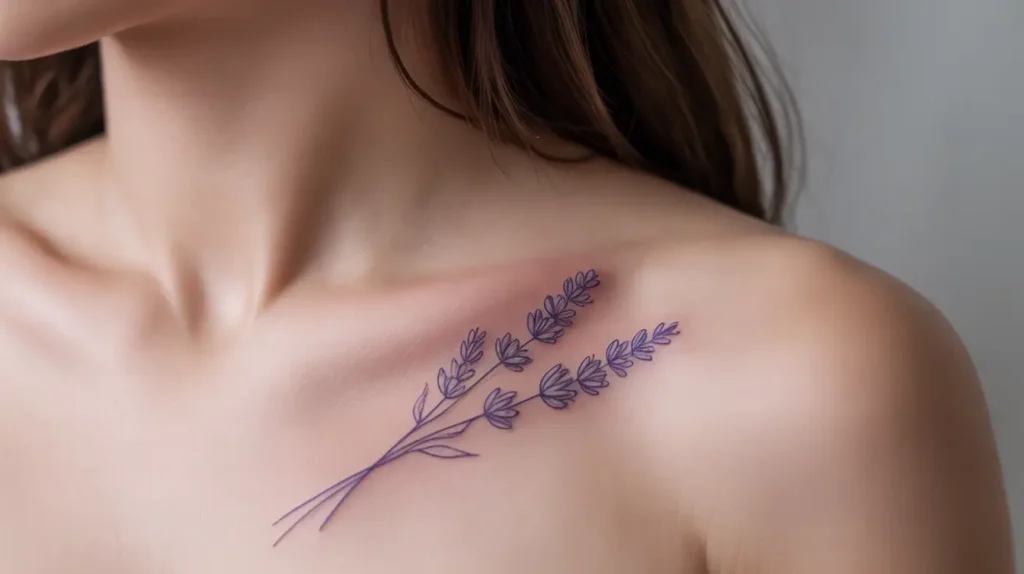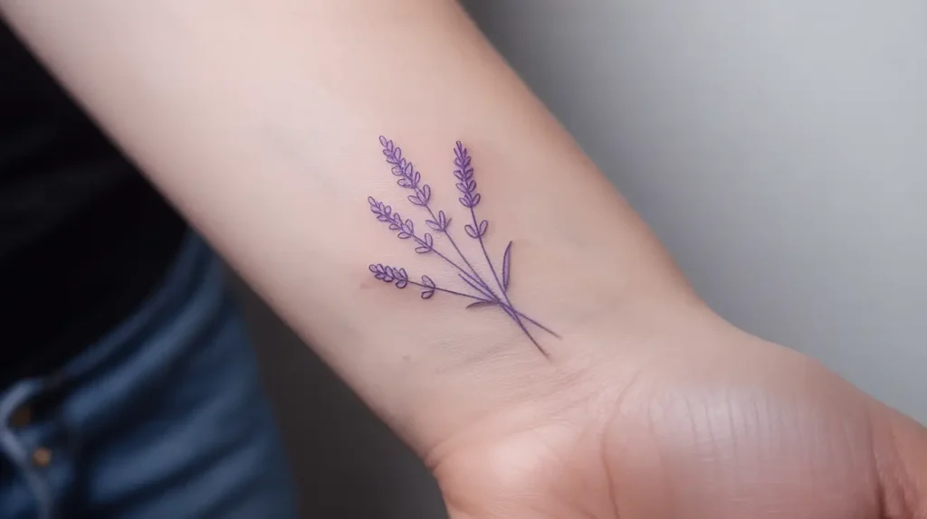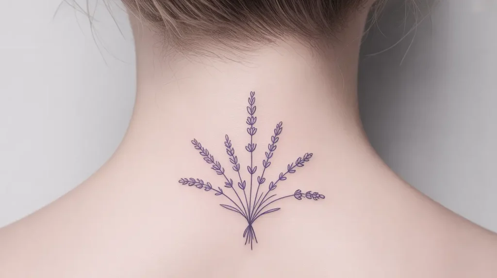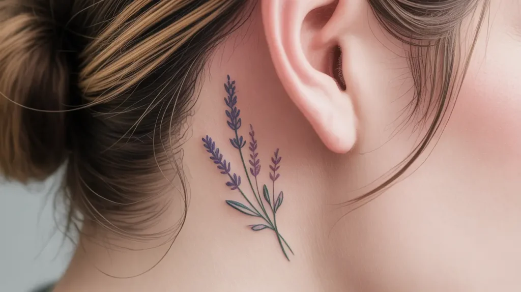 Lavender tattoo looks minimal and graceful behind the ear, on the wrist, collarbone and neck area. The thin stem and tiny flowers create a very soft look.