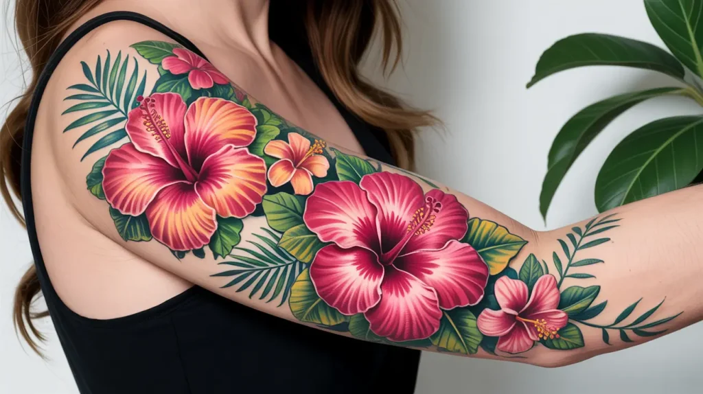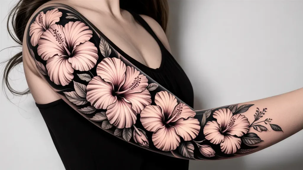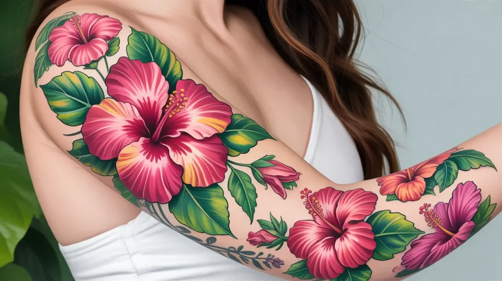 Hibiscus tattoos symbolize beauty, femininity, love, and success. A hibiscus on the sleeve feels bold. The petals create a confident and eye-catching design.