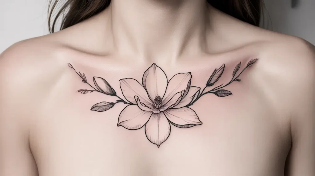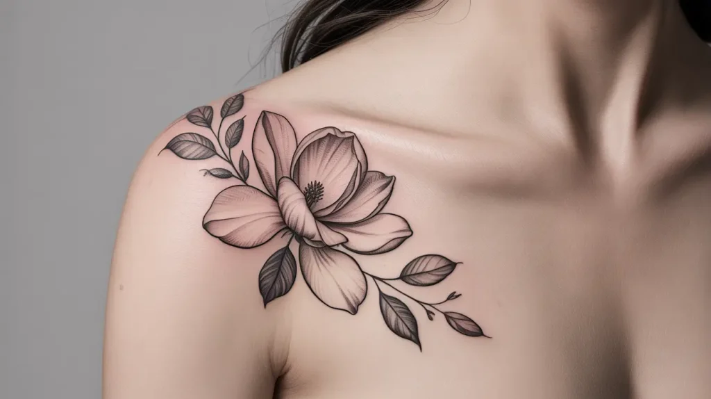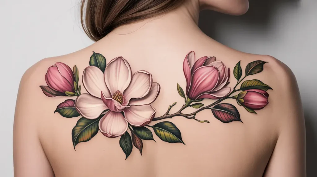 Magnolias feel soft yet strong. A medium-sized magnolia on the upper back creates a balanced and elegant composition. You can try on shoulder and upper chest area for bold and appealing look.