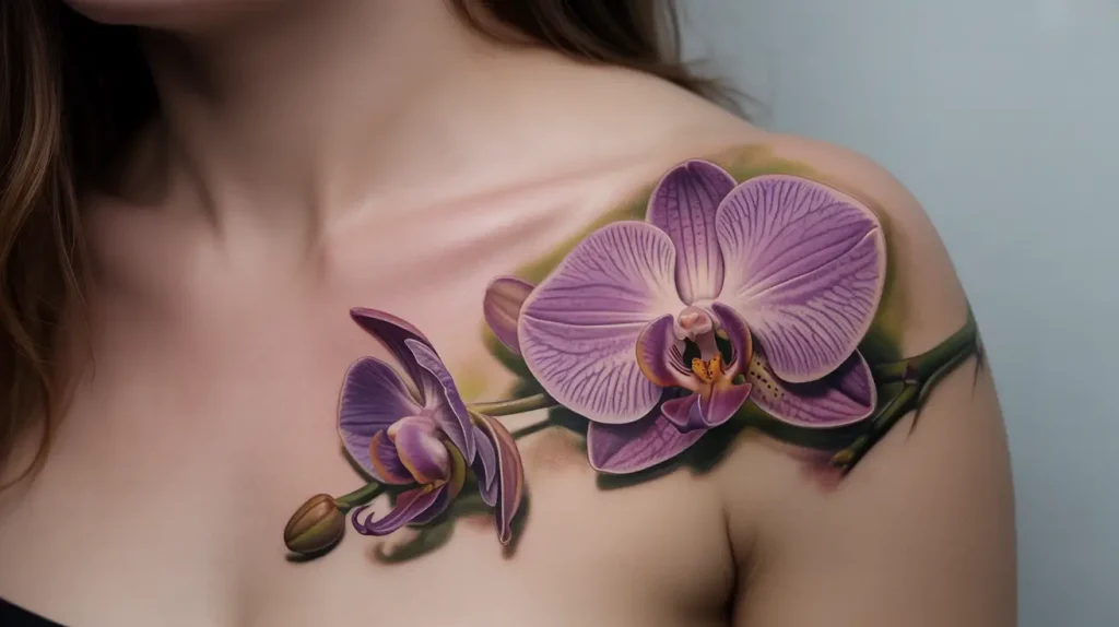 Orchids feel exotic. You may love this if you enjoy unique flowers rather than common ones. The shoulder blade gives space for flowing petals and subtle shading.