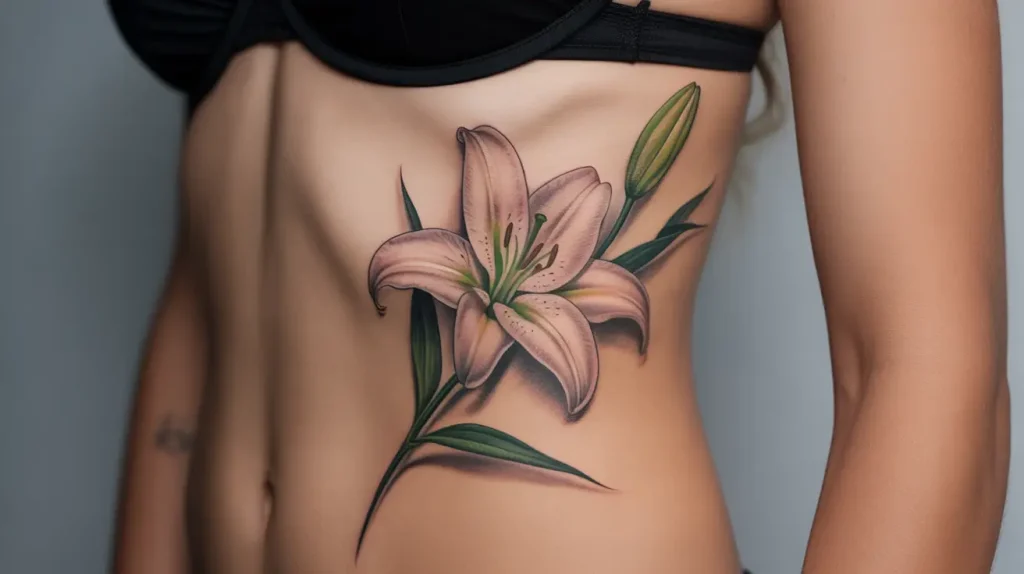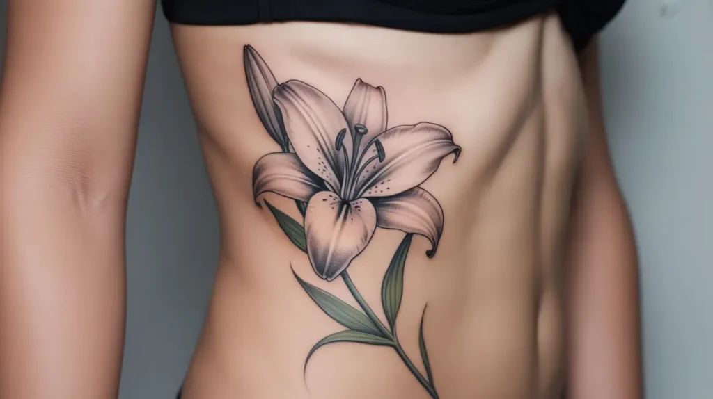 A lily along the rib cage looks elegant and slightly dramatic. The long petals and stem follow the curve of your body beautifully.