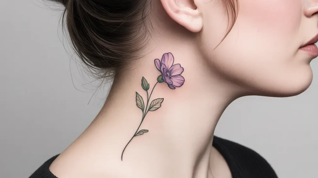 if you like subtle but noticeable tattoos, try violet flower tattoo on neck. A tiny violet near the side of the neck feels delicate and charming.