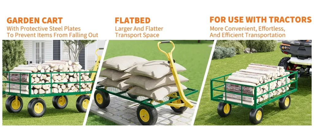 The smart multi-functional design lets it switch seamlessly between three modes: a fenced wagon for loose materials (soil, gravel, etc.), a flatbed wagon for large or bulky items, and a towable trailer. With a spacious 9.03 cubic foot cargo bed and removable side panels, it adapts instantly to different tasks, whether you’re gardening, farming, or moving big loads.