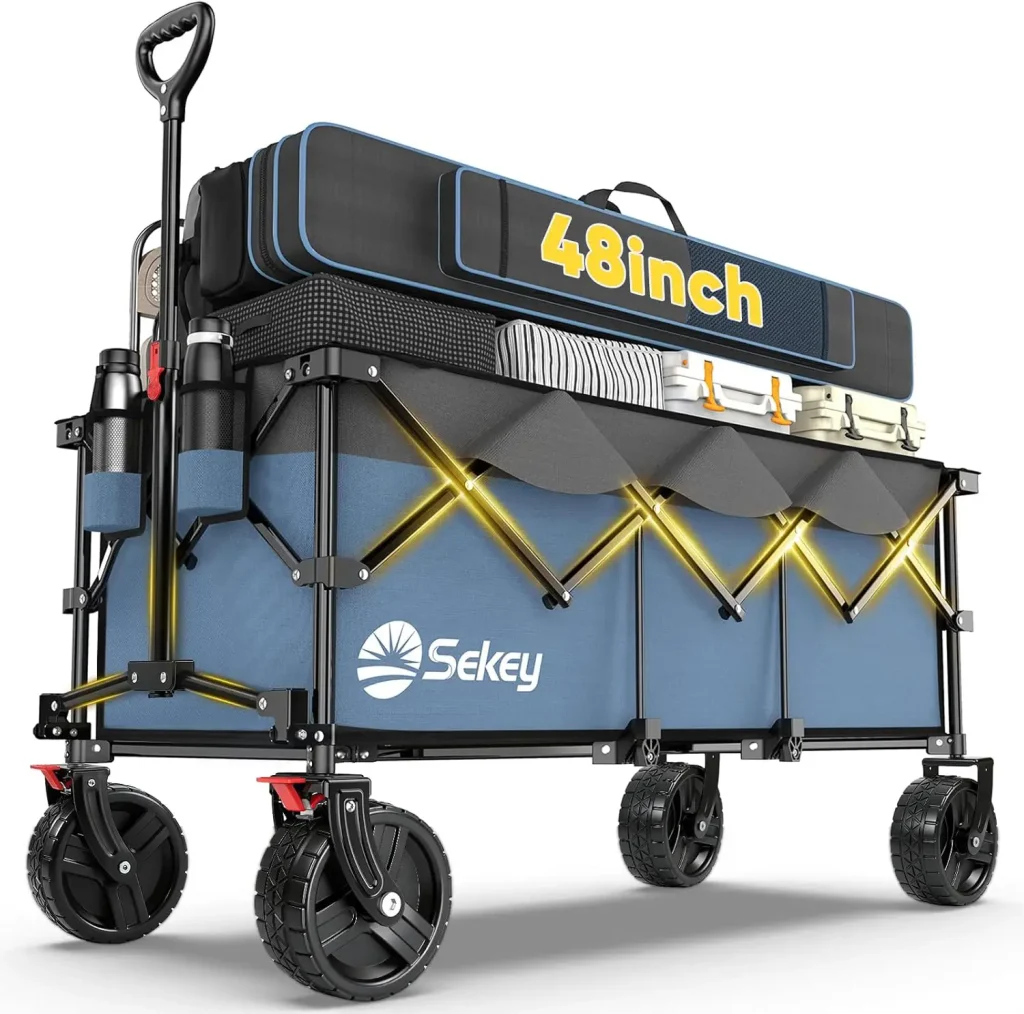 Despite its compact folded form, it delivers excellent stability with patented frame structure using pipes 20% thicker than normal wagons. It supports a solid 660 lbs load capacity and comes with big all-terrain wheels plus brakes, allowing it to move smoothly on grass, sand, gravel, or pavement.