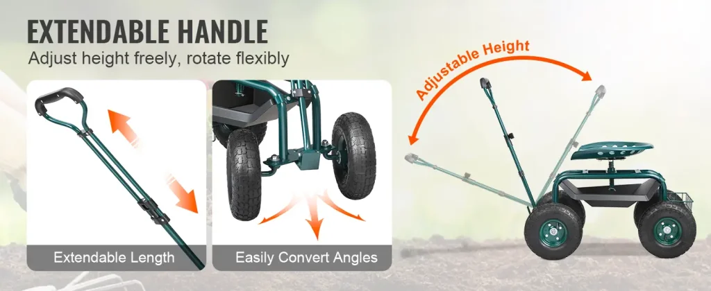 We tested the VEVOR Garden Cart Rolling Workseat, and what impressed us the most was its 360-degree swivel seat combined with a widened and thickened cushion that provides excellent comfort and relieves lower back and lumbar pressure even during long gardening sessions.