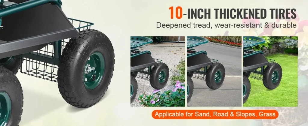 The innovative steel frame is engineered for quick assembly and long-lasting strength, while the powder-coated metal adds extra durability. Balanced 4-wheel stability and tight-turning steering make maneuvering simple, even in tight spaces or uneven terrain. The 10-inch pneumatic tires are built to handle grass, dirt, gravel, and rough ground with ease, so you can transport heavy loads without sinking or getting stuck.