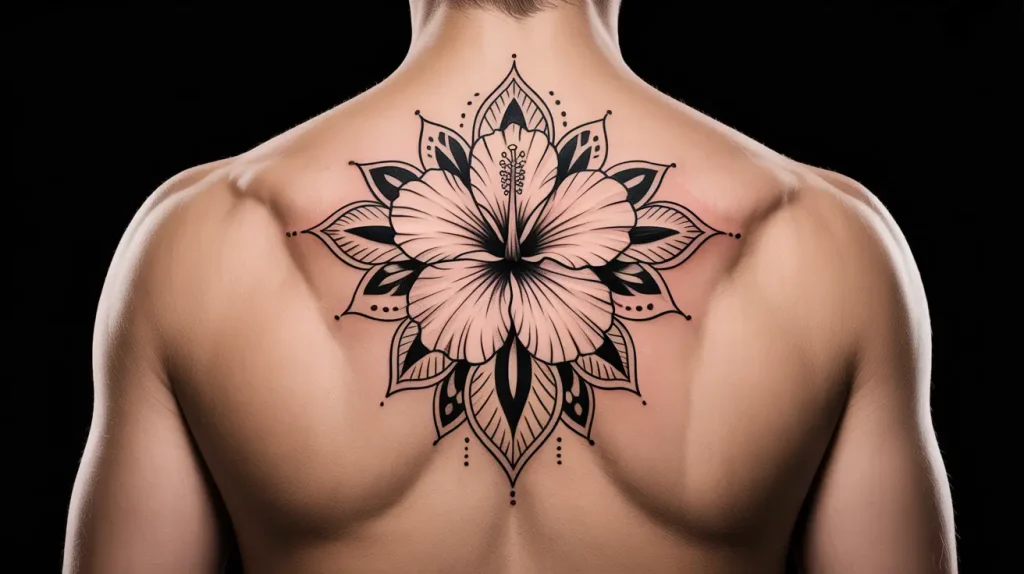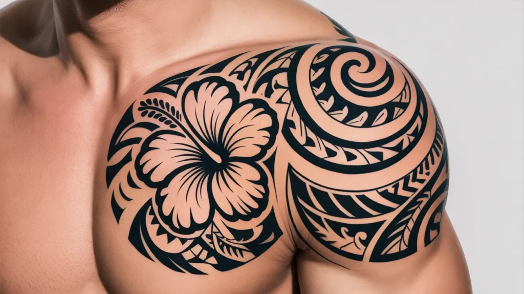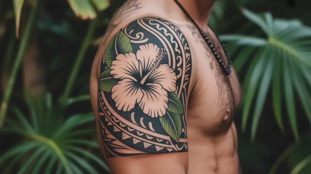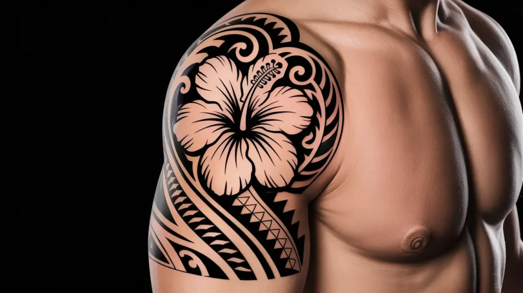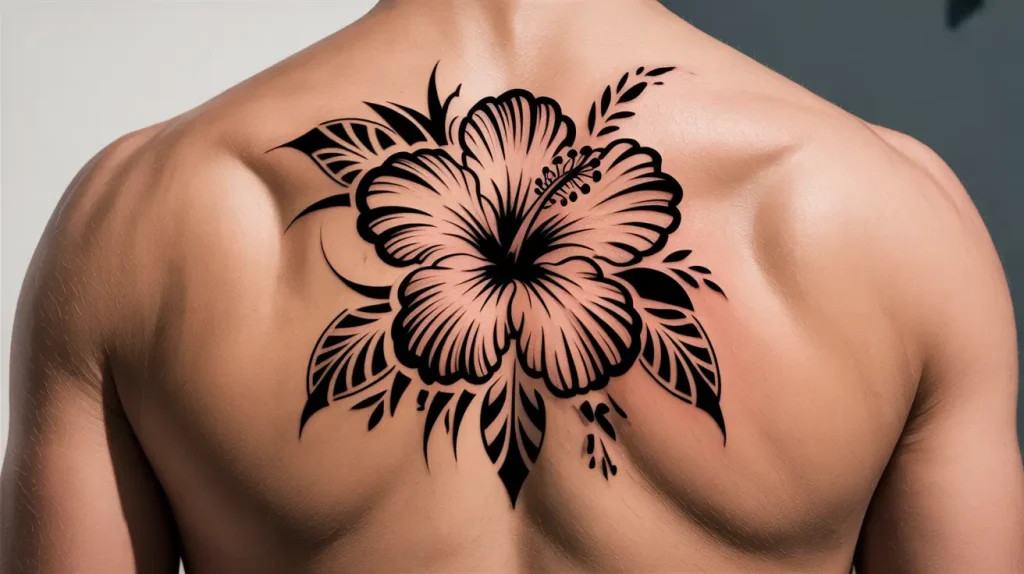 Tribal hibiscus tattoos reflect strength, heritage, and warrior energy. Bold black lines and Polynesian-inspired patterns make this design masculine and powerful.