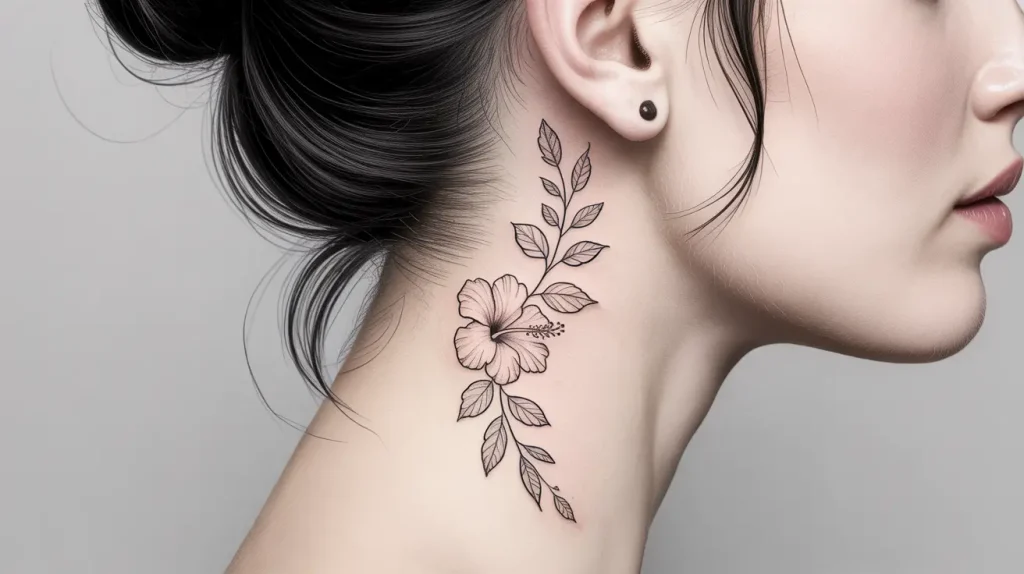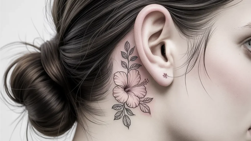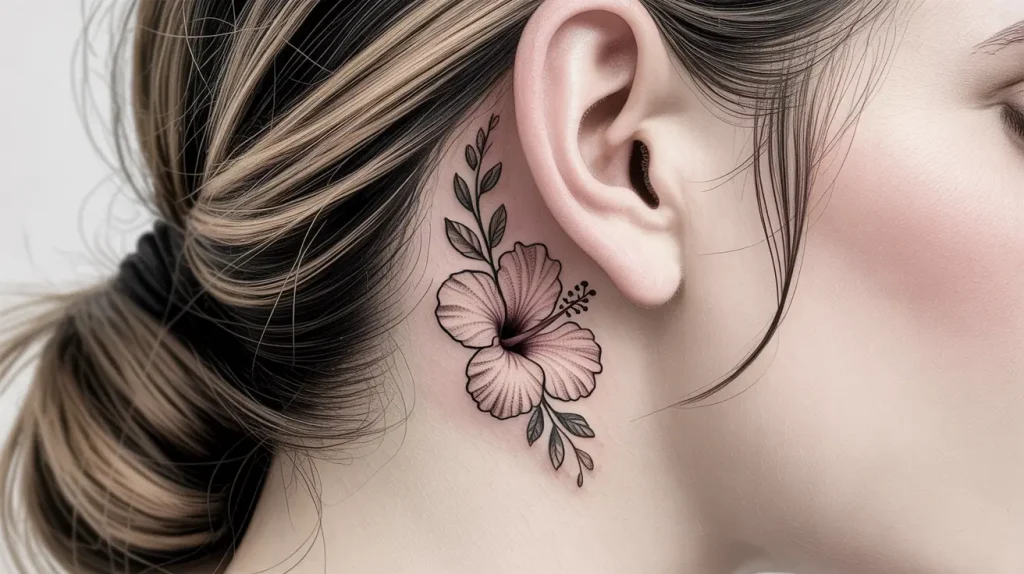A hibiscus tattoo behind the female ear is a delicate and eye-catching choice. This placement feels intimate and personal. The soft curves of the hibiscus petals naturally follow the shape behind the ear, creating a graceful and feminine look. It’s perfect for women who want something subtle but meaningful.