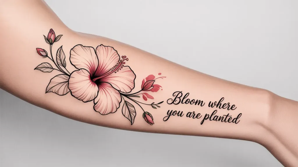 Pairing a hibiscus with a short quote adds emotional depth. Popular phrases include self-love, strength, or healing-related words.