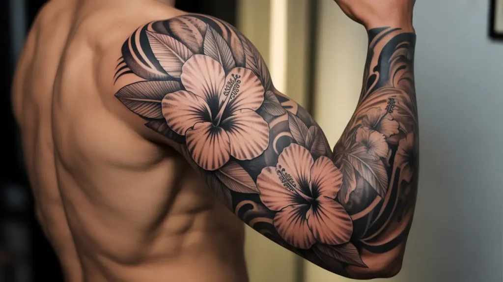 A full sleeve hibiscus tattoo can include waves, animals, or geometric elements for storytelling.