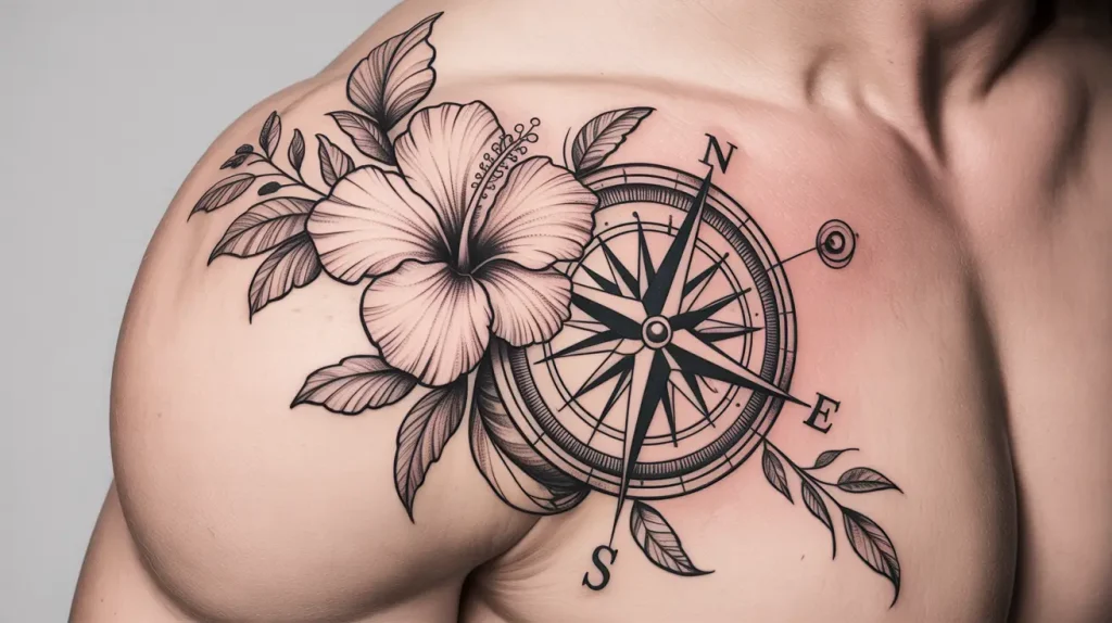 This tattoo represents direction, purpose, and journey. The hibiscus adds emotional warmth to the compass.