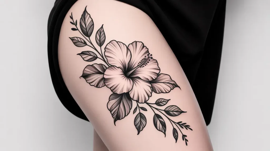 For women who prefer subtle elegance, black and grey hibiscus tattoos are a perfect match. The focus is on shading, depth, and realism rather than color.