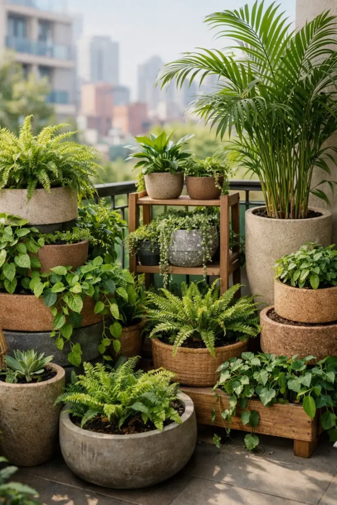 Stack pots on tiered stands, line up shelves against the wall, and hang baskets from the railing or hooks. Suddenly every inch has layers — tall plants reaching high, medium ones filling the middle, and trailing or low-growers spilling over the edges. The whole space turns green and full, with little pockets of shade and cozy nooks tucked between leaves.