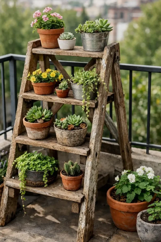 Old Ladder as a Tiered Plant Stand for Small Balcony Garden