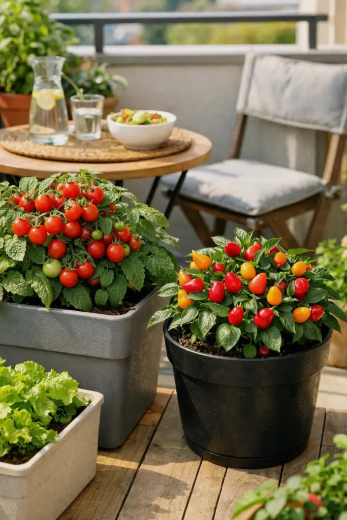 Choose varieties bred for containers: look for names like ‘Tiny Tim’, ‘Patio Choice’, ‘Red Robin’ or ‘Sweet 100’ for tomatoes, and ‘Mohawk’, ‘Apache’, ‘Fresno’, or ‘Mini Bell’ for peppers. They stay tidy, fruit early, and taste so much better than anything from the store — like sunshine you can eat.